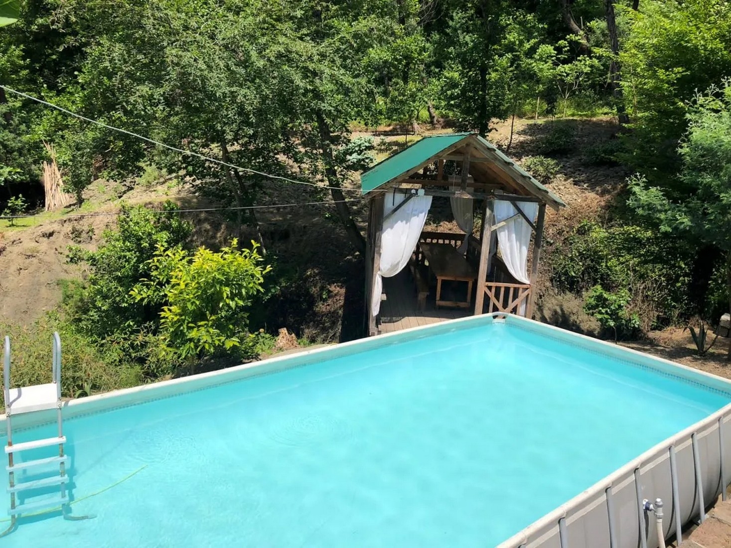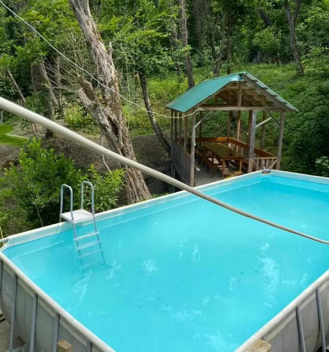 На территории также есть детская площадка, каркасный большой бассейн и бесплатная парковка для автомобилей.